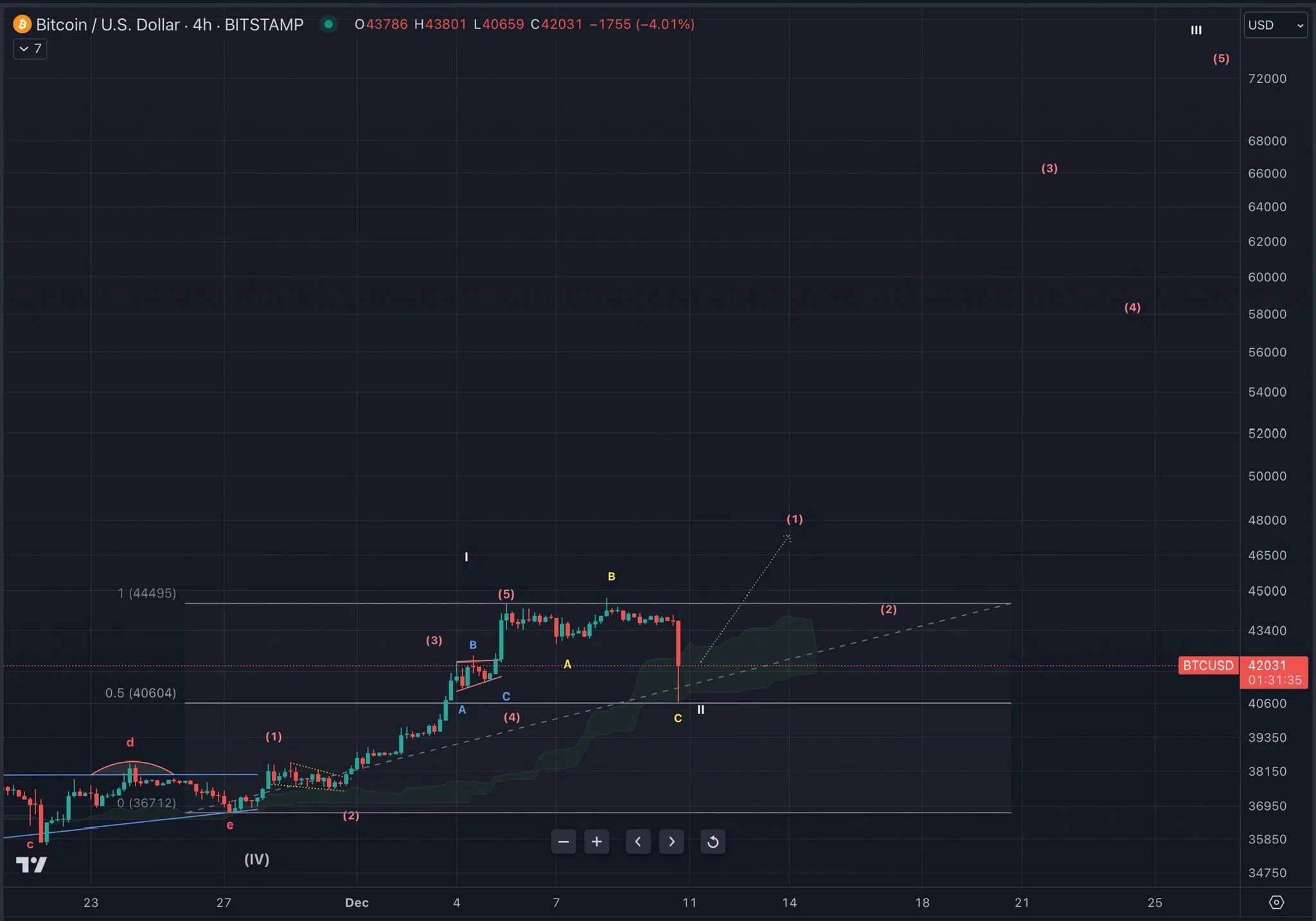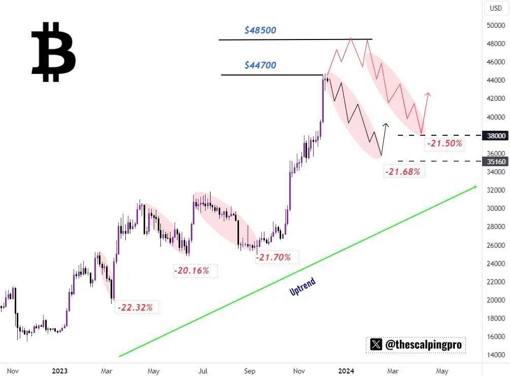 Похожий прогноз биткоина дал аналитик Mags. Он обратил внимание на то, что после существенного роста BTC всегда берет передышку. На этот раз, по его мнению, ситуация может повториться. При этом Mags считает, что коррекция может продолжиться в начале 2024 года. Предположительную траекторию движения BTC он обозначил на графике.
