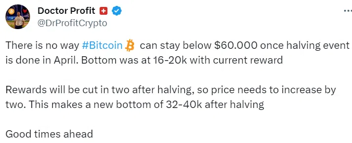При этом Doctor Profit дал позитивный долгосрочный прогноз биткоина. Он считает, что после халвинга, который состоится в апреле 2024 года, BTC направится к $60 тыс. Следующий циклический минимум после завершения роста на фоне сокращения скорости майнинга, по его подсчетам, может быть зафиксирован в диапазоне $32-40 тыс.