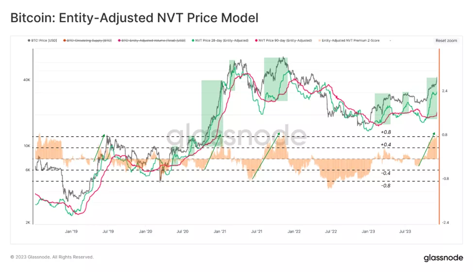 Еще одним измерением «справедливой цены» может выступать индикатор NVT Price. Аналитики рассмотрели 28-дневный 🟢 и 90-дневный вариант 🔴 метрики.
