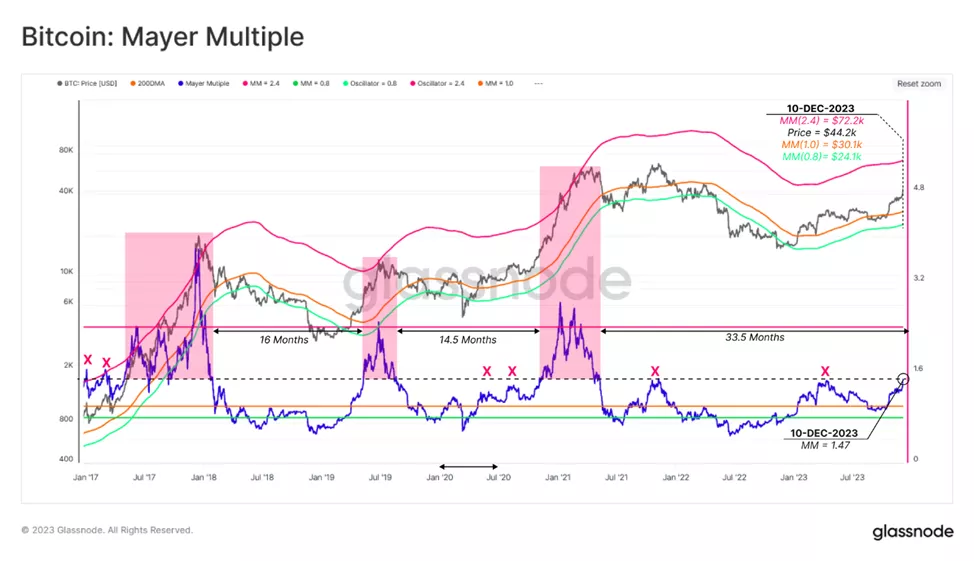 Основанный на 200D—MA индикатор Mayer Multiple достиг значения в 1,47, что близко к 1,5 — уровню сопротивления предыдущих циклов, включая достижение $ATH в ноябре 2021 года.
