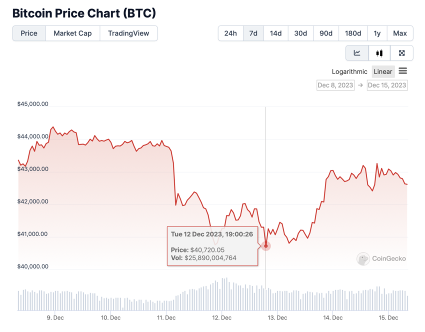 На этой неделе цена биткоина несколько раз падала ниже отметки $41 000. Однако после выхода данных по инфляции в США и заседания ФРС, на котором было объявлено о приостановке цикла подъема ключевой ставки, главная криптовалюта смогла отыграть часть потерь. На момент написания BTC торгуется в районе $42 600.