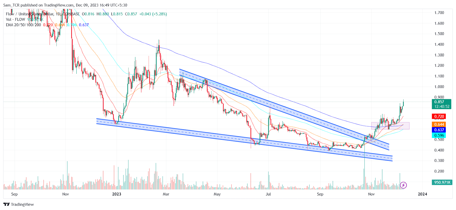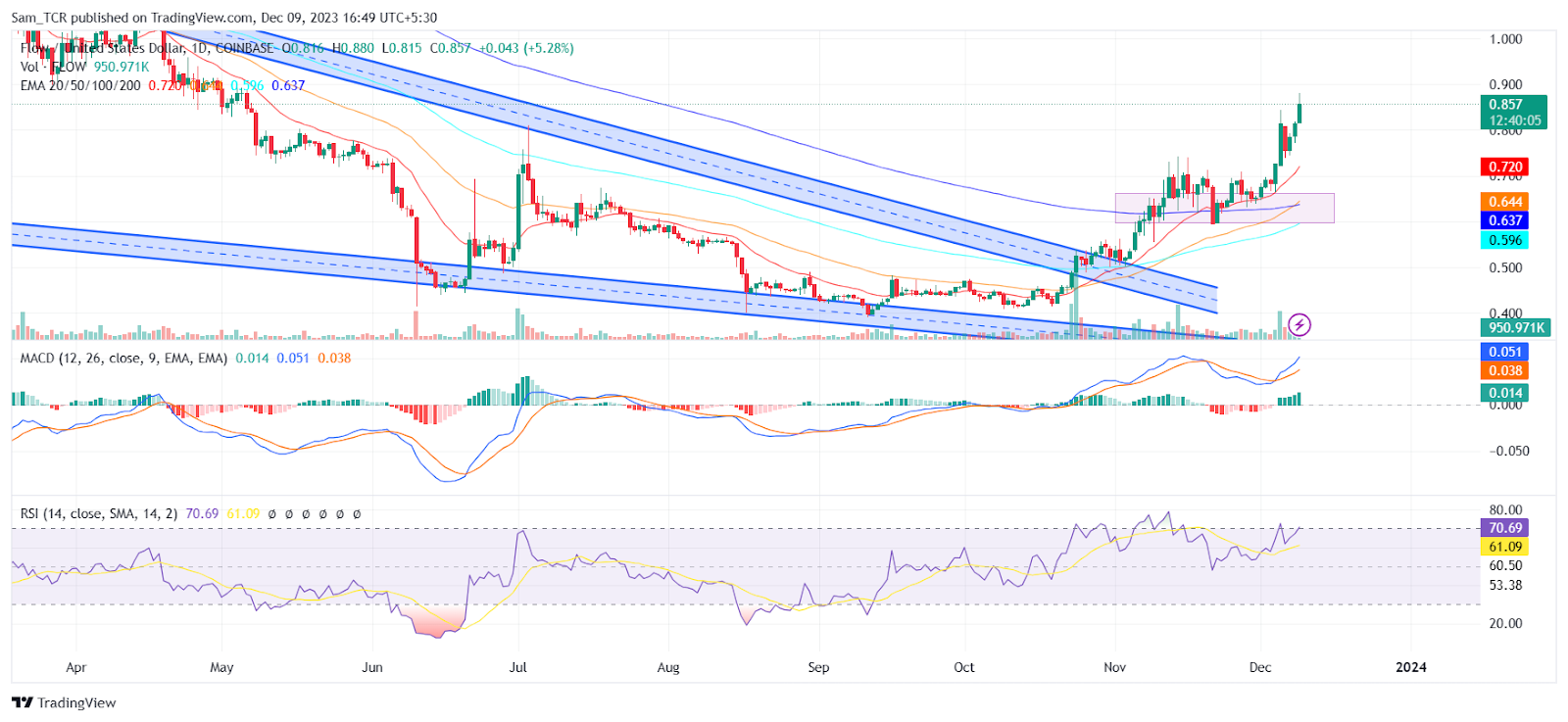 Во-вторых, прорыв подтверждается объемом торгов, который пробился выше нисходящей линии сопротивления (синяя стрелка), которая существует еще со времен альтсезона 2021 года. Ее прорыв тоже считается мощным бычьим сигналом.
