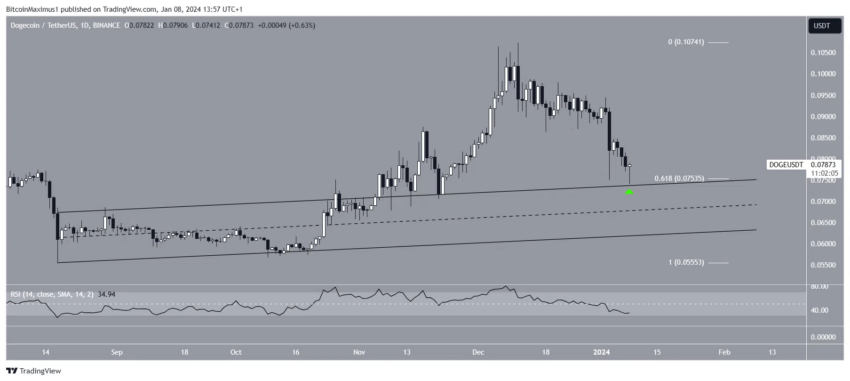 Технический анализ дневного таймфрейма показывает, что цена $DOGE вышла из восходящего параллельного канала 6 ноября 2023 года. Прорыв привел к достижению максимума в $0,108 11 декабря.