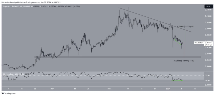 Если движение вверх продолжится, цена Dogecoin может вырасти на 13% и достичь нисходящей линии тренда сопротивления на уровне $0,089.