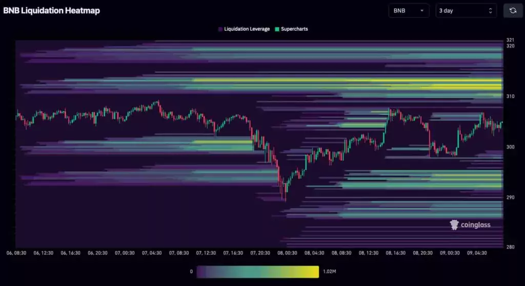 Тепловая карта ликвидации $BNB на 3 дня. Источник: CoinGlass