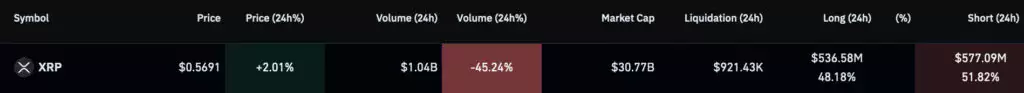 На текущий момент $XRP торгуется на уровне $0,559, при этом за последние 24 часа были открыты короткие позиции всего на $577,09 млн. Общий дневной объём составляет $1,04 млрд, в результате чего трейдеры шортами доминируют.