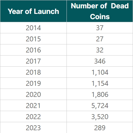 Самым худшим годом для стартапов в CoinGecko назвали 2021 год. Из появившихся тогда монет потерпели неудачу 5724 криптовалюты, что составляет более 70% от всех запущенных в этот период проектов.