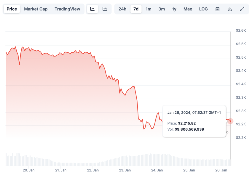 Ethereum продемонстрировал похожую динамику, снизившись в моменте до $2180.