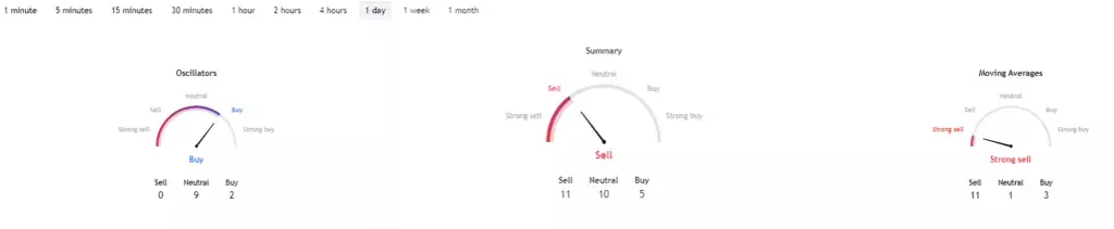 Технические индикаторы рисуют неблагоприятный прогноз для цены DOGE: сводка склоняется к сигналу «продажа» на отметке 11. Скользящие средние совпадают с рекомендацией «сильной продажи» на отметке 11, в то время как осцилляторы склоняются к сигналу «покупка» на отметке 2.