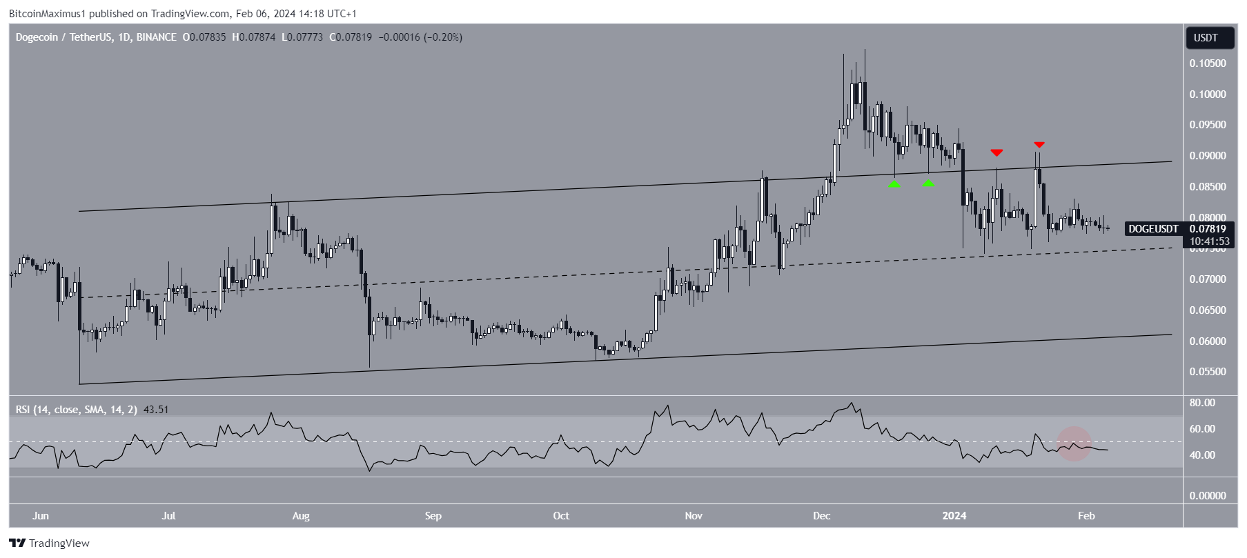 С тех пор цена мемкоина снизилась.В январе 2024 года она упала внутрь канала, дважды подтвердив его верхнюю границу в качестве сопротивления. Сейчас $DOGE торгуется вблизи средней линии канала.