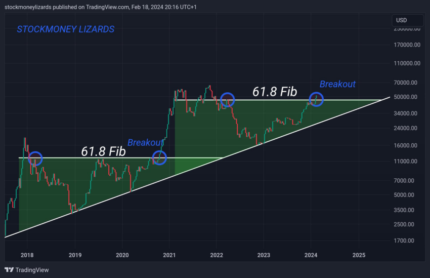 Позитивный прогноз биткоина также дал аналитик Stockmoney Lizards. Он обратил внимание на прорыв криптовалютой важного уровня Фибоначчи. Такое поведение криптовалюты в предыдущих циклах выводило монету в фазу активного роста. По мнению аналитика, на этот раз история может повториться. Упомянутый ранее Doctor Profit также видит в прорыве криптовалютой уровня Фибоначчи сигнал к дальнейшему росту.