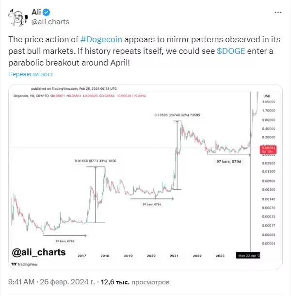 Известный эксперт по криптотрейдингу Али Мартинес считает, что текущее ценовое поведение Dogecoin, похоже, отражает закономерности, наблюдавшиеся на предыдущих бычьих рынках, в том числе в 2017 и 2021 годах.