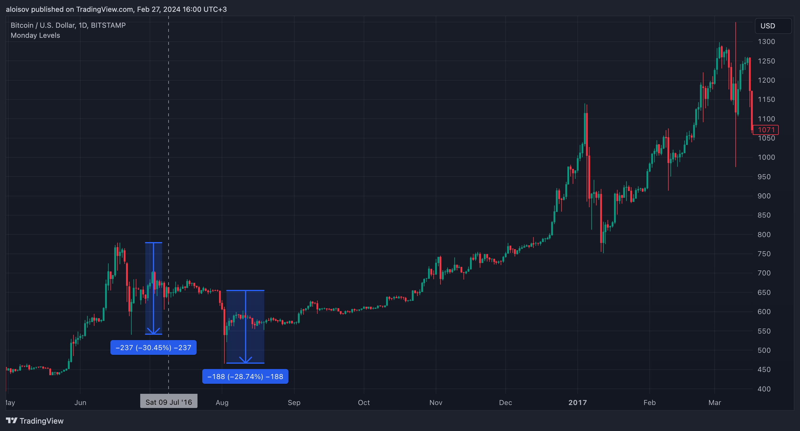 В 2016 году были две коррекции, связанные с халвингом: одна началась за неделю до ключевого события и достигла 30%, вторая — через 3 недели после халвинга и составила 28%. В сумме разница между максимум цены до халвинга и минимум после него превысила 40%.