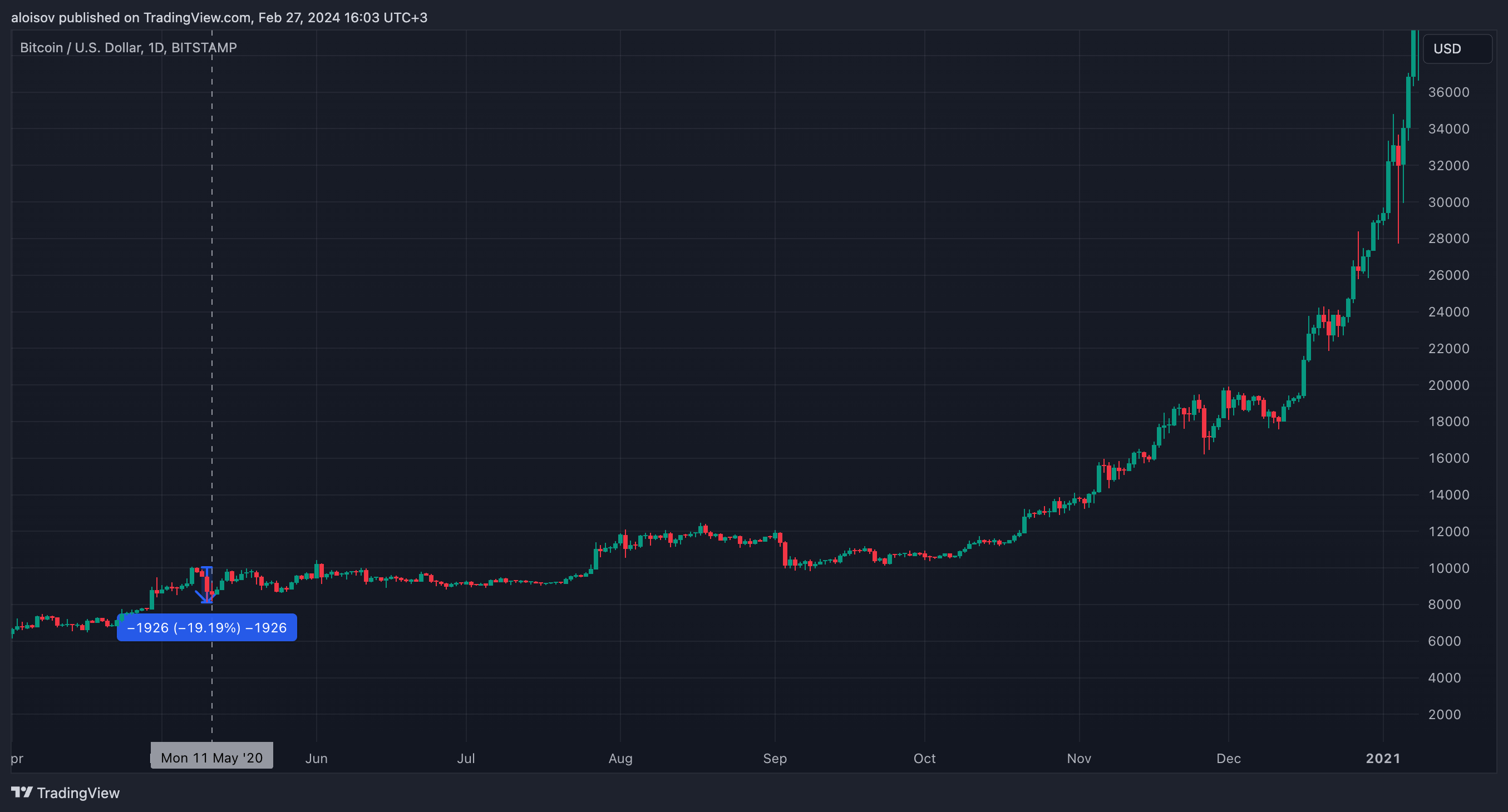 В 2020 году коррекция началась за 3 дня до халвинга и составила 19%. Интересно, что после этого началось боковое движение, которое продлилось 5 месяцев — до начала октября.