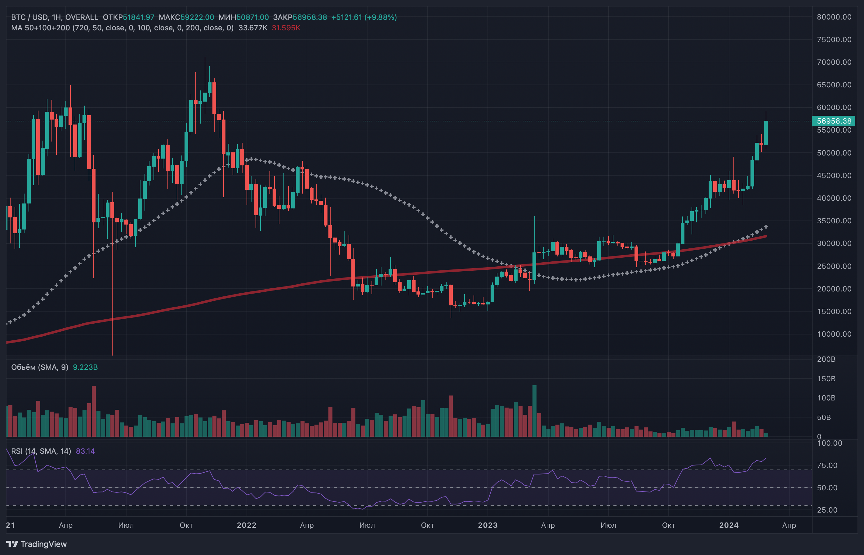 По данным скринера криптовалют Cryptovizor, определяющего цену BTC/USD по результатам торгов на спотовых биржах, актив достиг максимума на отметке $59 222.