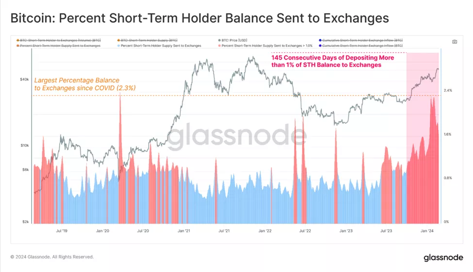 В пользу вывода об ажиотаже покупателей также говорит динамика относительной доли отправленных краткосрочными трейдерами монет на централизованные платформы. В разрезе одного дня с октября 2023 года показатель вырос с 1%+ до максимальных с распродажи в марте 2020 года 2,36%.