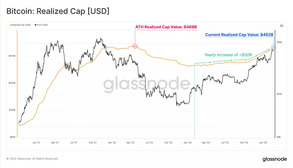 Аналитики отметили, что консолидацию вокруг $52 000 до рывка к $59 000 поддерживали свежие притоки капитала. Это проявилось в повышении метрики реализованной капитализации на $30 млрд с начала года. Индикатор достиг уровня в $460 млрд, что лишь на 3% уступает $ATH.