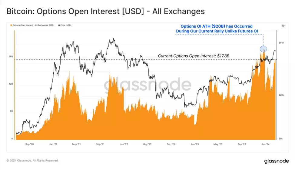 На рынке опционов ОИ подскочил до $17,8 млрд, подойдя почти вровень к рынку фьючерсов. В моменте метрика достигла нового $ATH в $20 млрд.