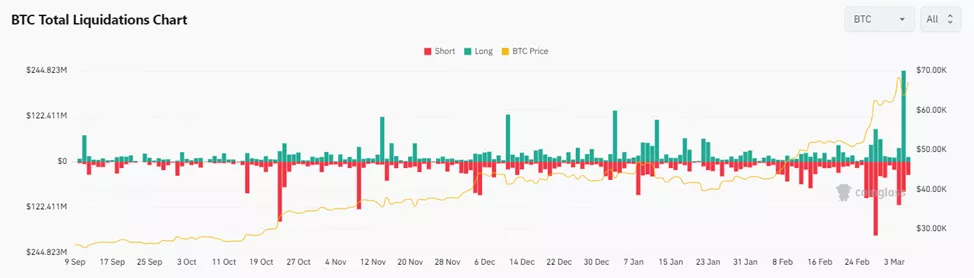 Согласно Coinglass, 5 марта объем принудительно закрытых длинных позиций по бессрочным контрактам достиг $244 млн. Перед этим объем открытого интереса (ОИ) вырос до рекордных $30 млрд. Ставка финансирования по лонгам в пересчете на год достигла внушительных 100%.