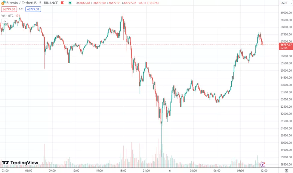 5 марта после роста к $69 000 в течение последующих пяти часов курс обвалился до $59 000. В дальнейшем наблюдалось восстановление до $67 000.