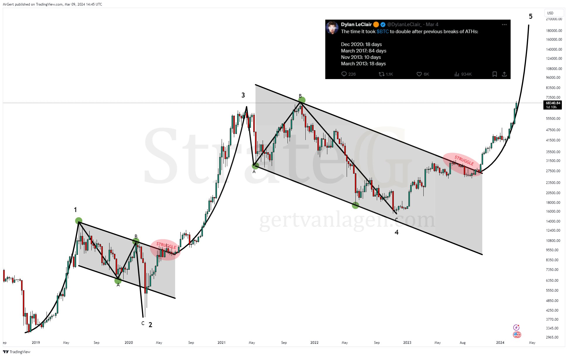 Аналитик Герт ван Лаген дал один из самых оптимистичных прогнозов биткоина. По его мнению, криптовалюта сможет прорвать уровень $100 тыс. в ближайшее время. Свои подсчеты он построил на базе данных о движениях BTC в предыдущих циклах. Для анализа он взял информацию о временном отрезке, который потребовался криптовалюте для двоекратного роста после обновления абсолютного максимума стоимости.