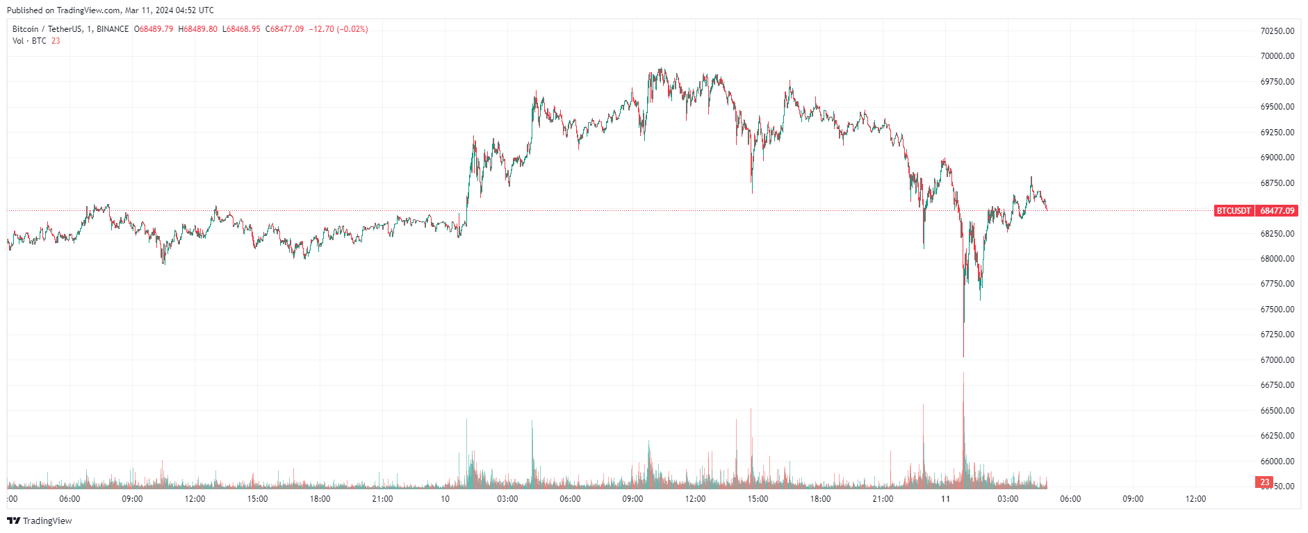 8 марта 2024 года биткоин в моменте прорвал уровень $70 тыс. Абсолютный максимум (ATH) криптовалюты, по данным CoinMarketCap, зафиксирован на уровне $70 083. После монета перешла в коррекцию. Криптовалюте удалось повторно обновить ATH спустя три дня после предыдущего раза. Новую рабочую неделю BTC начал с восстановления после снижения к $67 194.