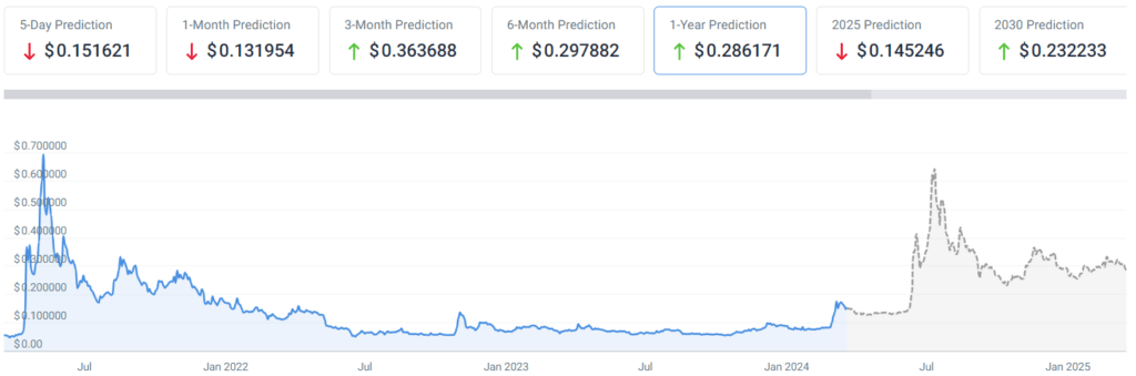 В этом году знаменитый токен-мем сумел увеличить свою цену более чем на 60%, что, несомненно, поддерживается восхождением биткоина. Тем не менее алгоритмы прогнозируют, что к 31 декабря 2024 года цена DOGE достигнет $0,291696, что будет представлять собой увеличение на 98,55% по сравнению с текущей ситуацией.