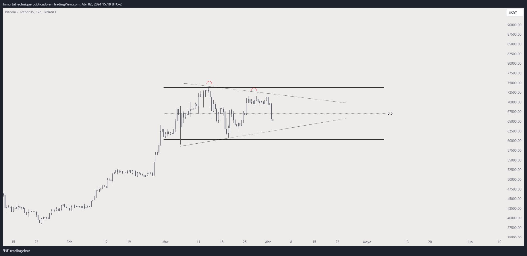 Похожий прогноз биткоина дал трейдер Inmortal. Он предположил, что BTC может продолжить двигаться в теле треугольника, границы которого он очертил на графике.