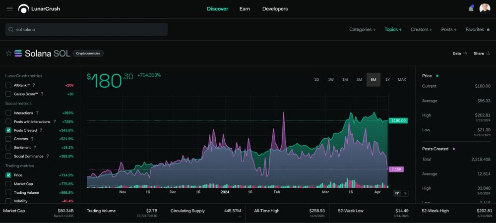 Сообщения с упоминанием «Solana» или «SOL» за последние шесть месяцев. Источник: LunarCrush.