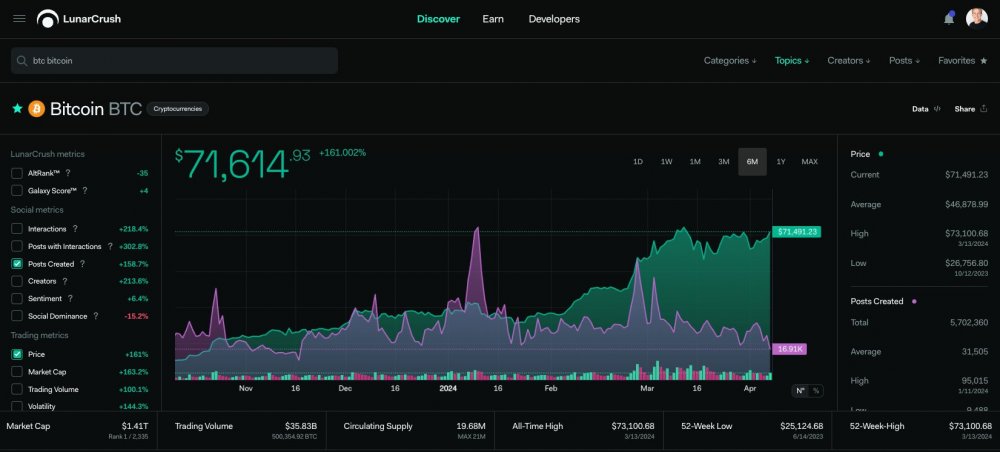 Сообщения с упоминанием ключевых слов «Bitcoin» или «BTC», за последние шесть месяцев. Источник: LunarCrush.
