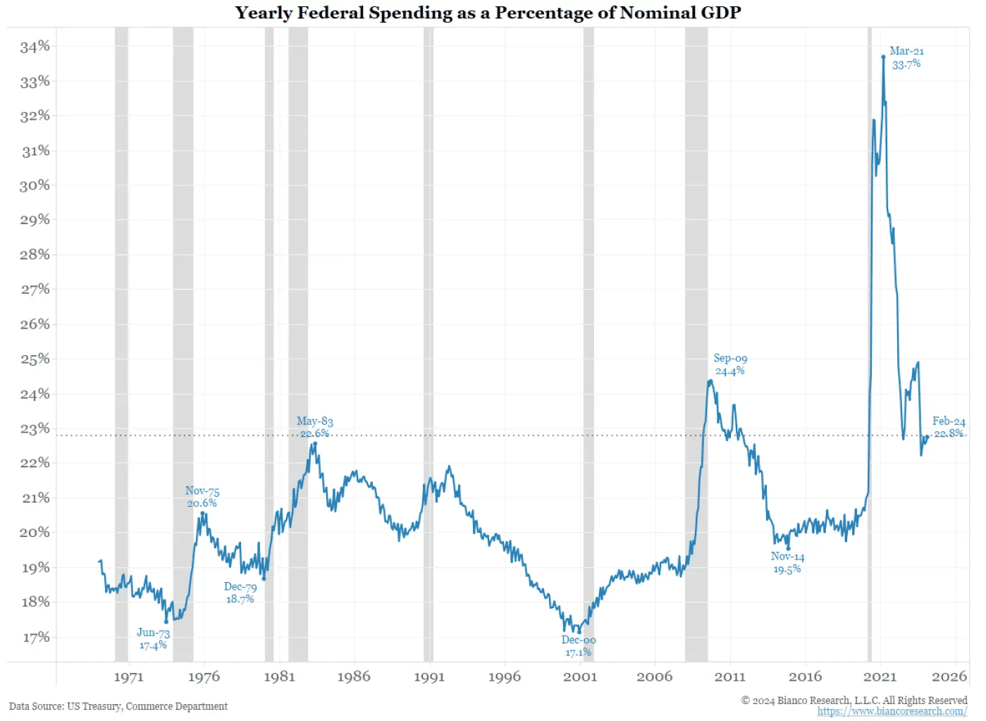 На рост номинального ВВП напрямую влияют государственные расходы. Так, расходы правительства США составляют 23 % номинального ВВП. Это означает, что правящая партия может нарисовать какой угодно рост, если она готова занять достаточно денег для финансирования своих расходов.