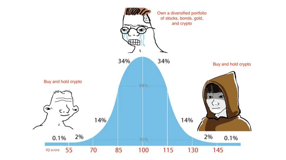 Многие пытаются удержаться в центре «кривой инвесторов», ориентируясь при принятии решений на рыночную ситуацию. Однако настоящие «криптолегенды» и дегены находятся в левой части этого графика — они просто покупают, покупают, а затем покупают еще, пока бычий рынок набирает обороты.