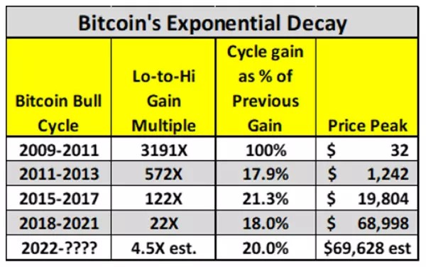В представленной выше таблице показана величина или кратность прироста предыдущих буллранов и экспоненциальных распадов биткоина.