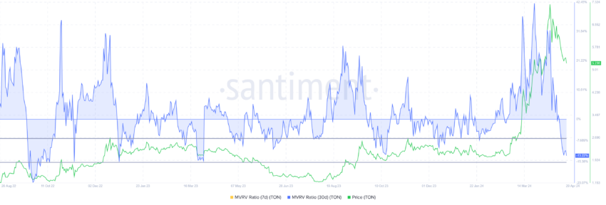 Согласно коэффициенту отношения рыночной и реализованной стоимости (MVRV), альткоин нагревается из-за недавнего инцидента. Эта ончейн-метрика отслеживает прибыли и убытки инвесторов. Значение 30-дневного MVRV для Toncoin составляет -13,22%, что свидетельствует о потерях. Однако исторически сложилось так, что зона MVRV от -10% до -20% также известна как зона возможностей для накопления. Оно приведет к резкому повышению спроса, что может спровоцировать рост цены.