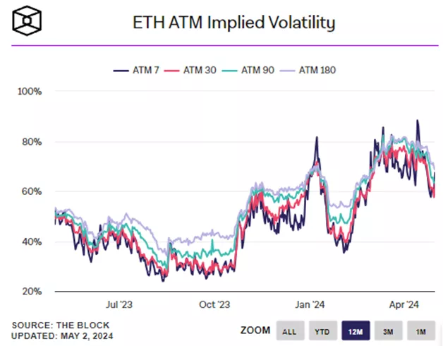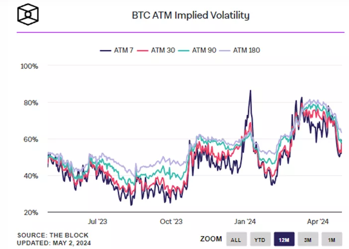 По словам эксперта, с середины апреля подразумеваемая волатильность (IV) опционов «при деньгах» упала с более 77% до менее 60% по недельным, месячным и многомесячным контрактам.