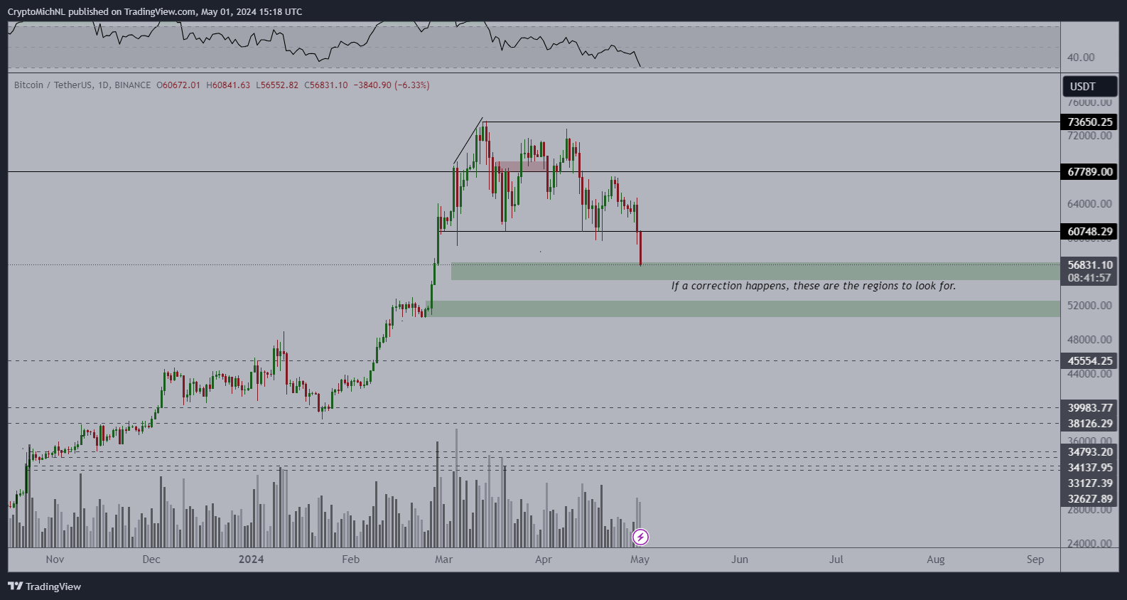 Аналитик Михаэль ван де Поппе предположил, что BTC находится в процессе поиска локального дна. При этом он отметил, что если уровень $56 тыс. не устоит, монета рискует упасть к $50 тыс. Спуск к минимумам 1 мая аналитик объяснил реакцией рынка на очередное решение ФРС по ставке. Поппе не видит предпосылки для выхода BTC в активный рост в ближайшее время. По его мнению, наиболее вероятным сценарием будет боковое движение близ занятых позиций. При этом аналитик считает, что падение BTC открыло хорошую возможность для входа в рынок.