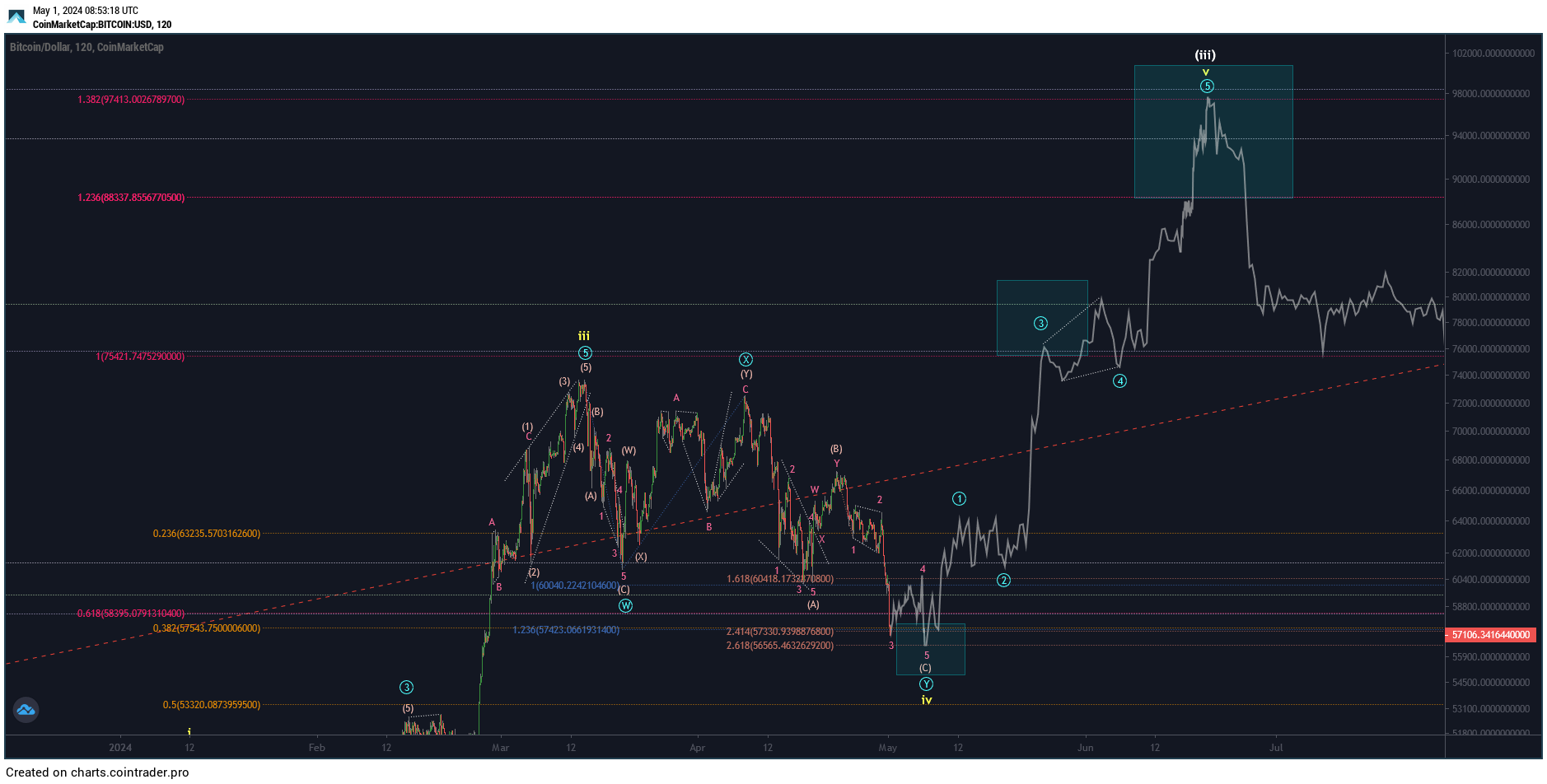 Автор канала 24KCrypto в X поддержал позитивный прогноз биткоина Captain Faibik. По его мнению, криптовалюта сможет обновить абсолютный максимум в конце мая. Предполагаемую траекторию монеты 24KCrypto обозначил на графике.