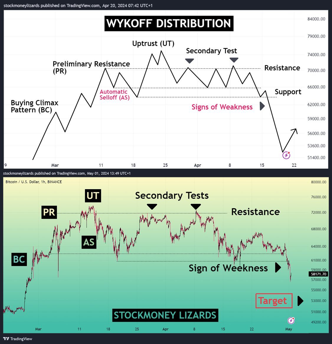 Трейдер Stockmoney Lizards в свою очередь видит на графике BTC распределение Вайкоффа. Фигура, по его мнению, подразумевает коррекцию после касания уровней близ $53 тыс.