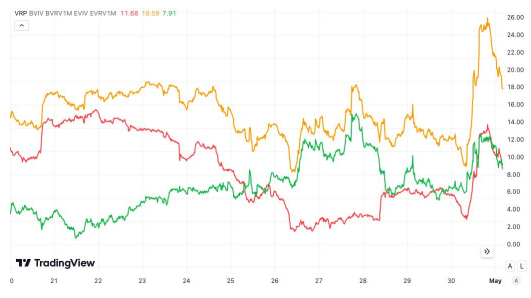 Согласно данным TradingView, в недавний период корректировки рынка после халвинга премия за риск волатильности биткоина (VRP) снизилась до 8%, в то время как VRP эфира упала до 18%.