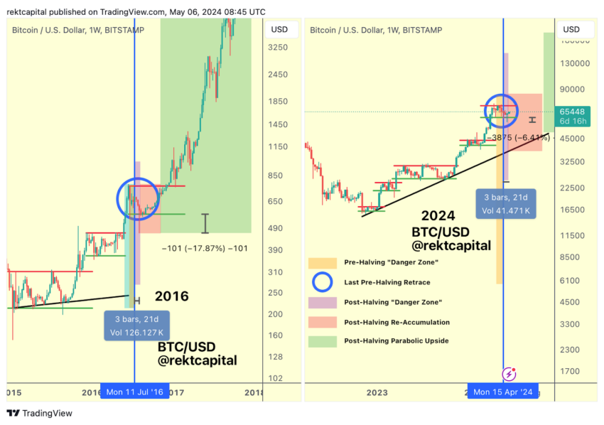 Rekt Capital описывает «Зону опасности» как три недели повышенной волатильности после халвинга. Исторически на этом этапе происходили падения цены. Однако со временем коррекции становились все менее глубокими: если в 2016 BTC просел на 17%, в этом году цена главной криптовалюты опустилась всего на 6,5%, а фаза накопления началась раньше, чем прогнозировалось.