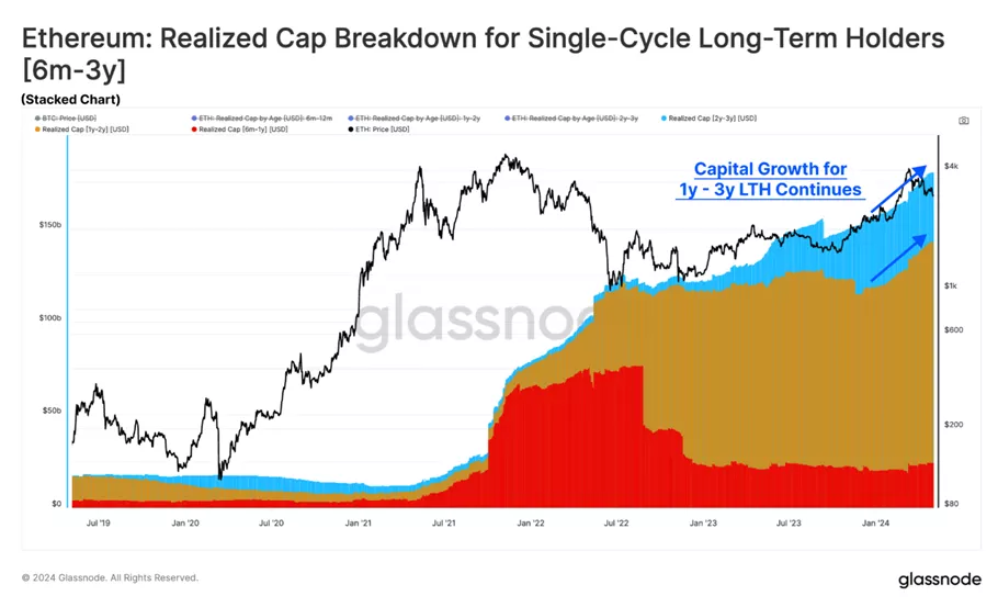 Расхождение наблюдается и в поведении долгосрочных держателей. Если в биткоине ходлеры, особенно держатели монет «возрастом» от двух до трех лет, воспользовались ралли на ожиданиях и запуске ETF для фиксации прибыли, то в Ethereum им приходится «терпеливо ждать повышения цен».