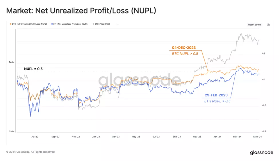 На фоне ажиотажа и ралли, связанного с одобрением спотовых биткоин-ETF, нереализованная прибыль держателей цифрового золота росла существенно быстрее, чем у инвесторов во вторую по капитализации криптовалюту. В результате NUPL первого пересекла пороговое значение 0,5 и вошла в фазу эйфории на три месяца раньше, чем индикатор второй.