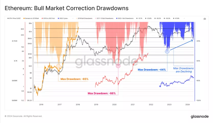 Аналитики указали на высокое сходство в структуре просадок между текущим и бычьим рынком 2015–17 годов (отмечен синим цветом). В качестве объяснения родства с этим периодом, для которого было характерно отсутствие деривативов, эксперты привели значительное сокращение левериджа из цикла 2020–22 годов и запуск ETF в США.