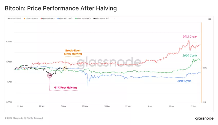 После четвертого в истории уменьшения награды майнерам вдвое курс цифрового золота испытал самую глубокую со времен краха FTX 11% коррекцию до минимальных за два месяца $57 000. После этого последовало быстрое восстановление. Подобная динамика в целом соответствовала поведению после халвинга в прошлом.