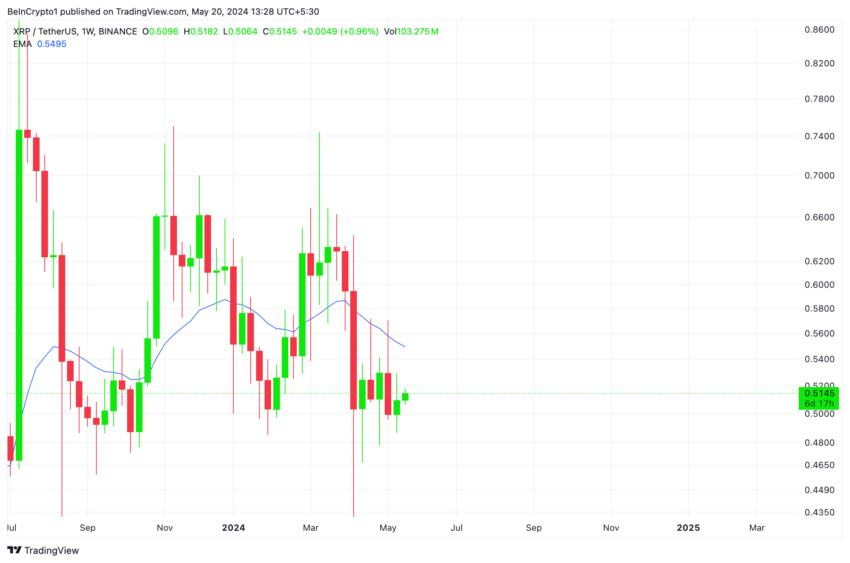 В настоящее время XRP торгуется ниже 20-дневной экспоненциальной скользящей средней (EMA) на уровне $0,51. Цена пересекла ее 13 мая, подтвердив рост давления продаж.