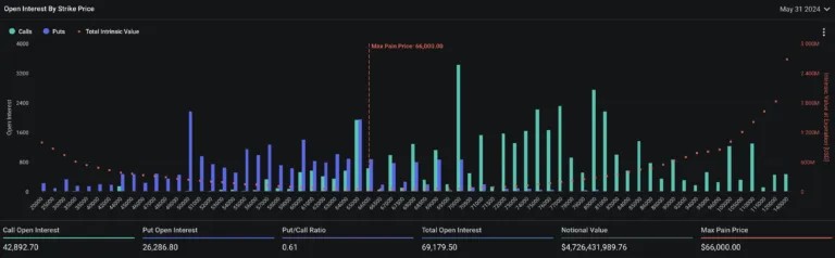 По данным Deribit, соотношение пут и колл опционов на BTC держится на уровне 0,61. Это означает, что трейдеры по-прежнему сохраняют бычий настрой, и количество коллов, или длинных контрактов, превосходит количество путов, или коротких контрактов. Максимальная болевая точка — то есть цена, при достижении которой актив принесет финансовые потери наибольшему числу держателей, — находится на отметке $66 тыс.