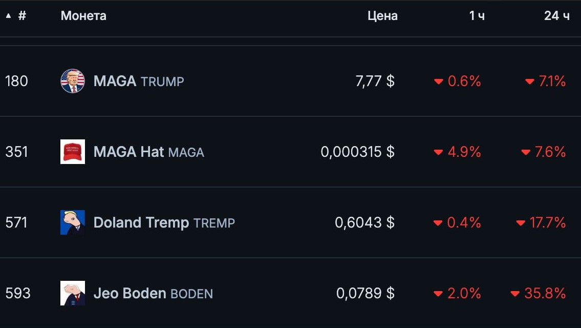 Курсы криптовалют, условно связанных с Трампом, включая Super Trump, MAGA и Donald Tremp, потеряли от 6 до 9%. Лидером стал токен MAGA Hat (MAGA): цена криптовалюты за минувшие сутки снизилась на 9,3%, до $0,0003, при капитализации $125 млн. Курс токена Jeo Boden (BODEN) просел более чем на 30%, до $0,08.