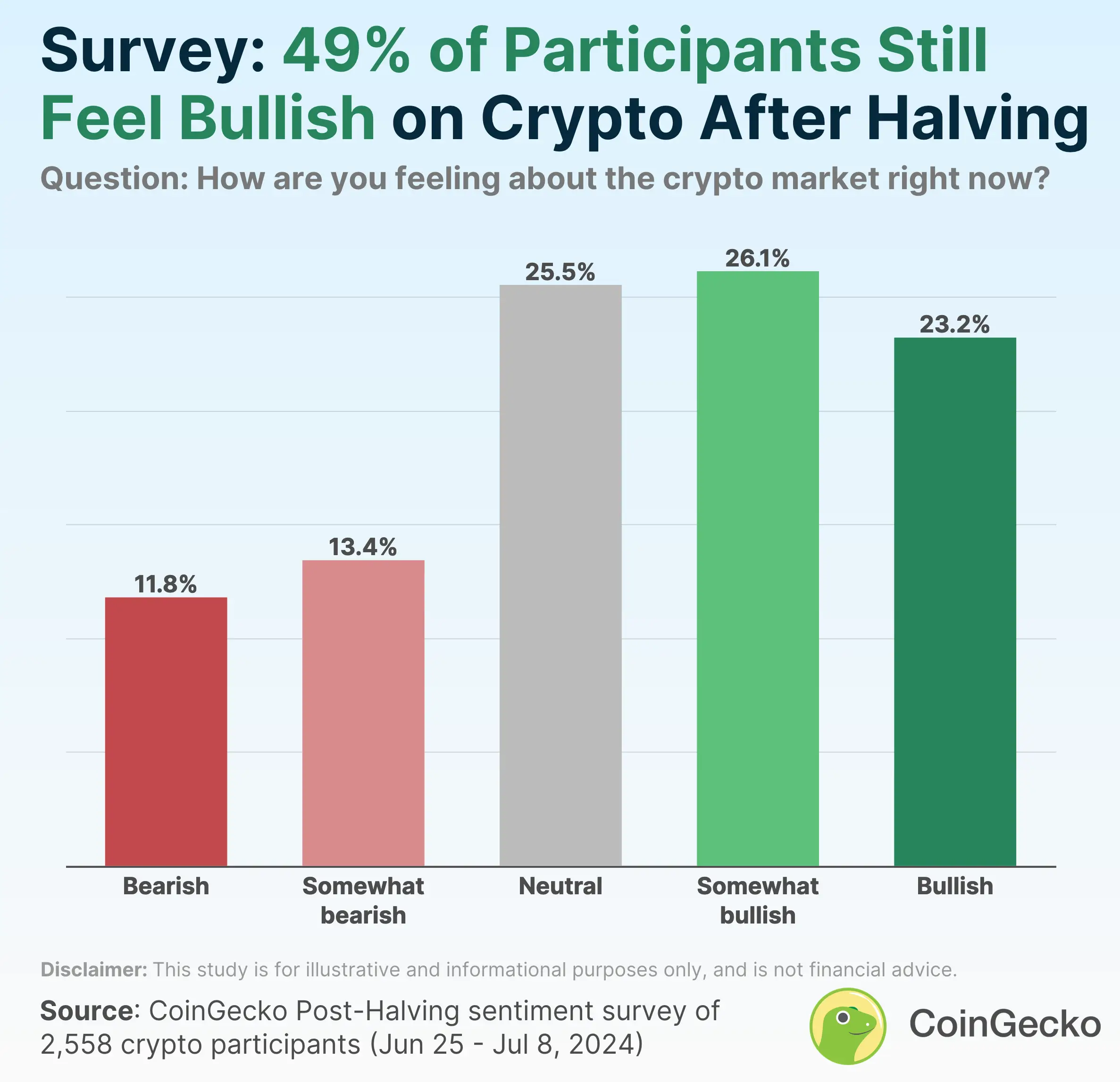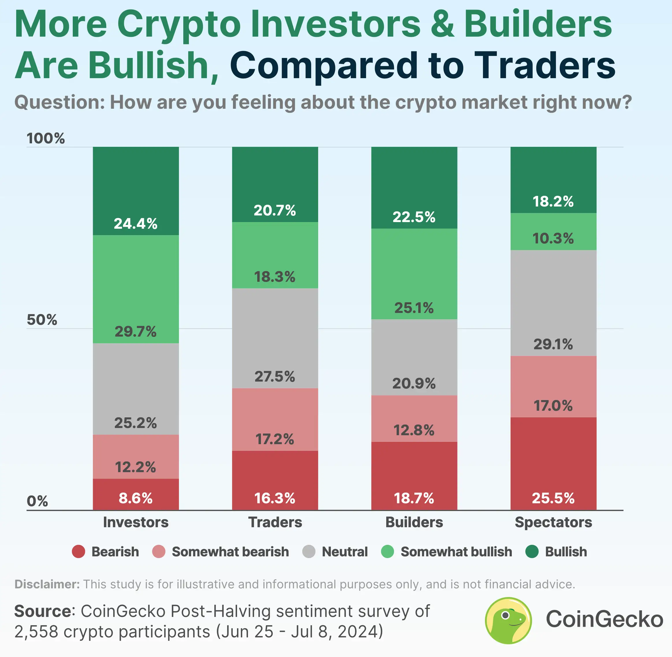 В целом из всех категорий наиболее позитивно настроены те, кто готов держать свои цифровые активы на долгий срок. Очевидно, если бы эксперты CoinGecko провели такой же опрос при устойчивом буллране — например, в первой половине весны 2024 года — настроения были бы совсем другими.