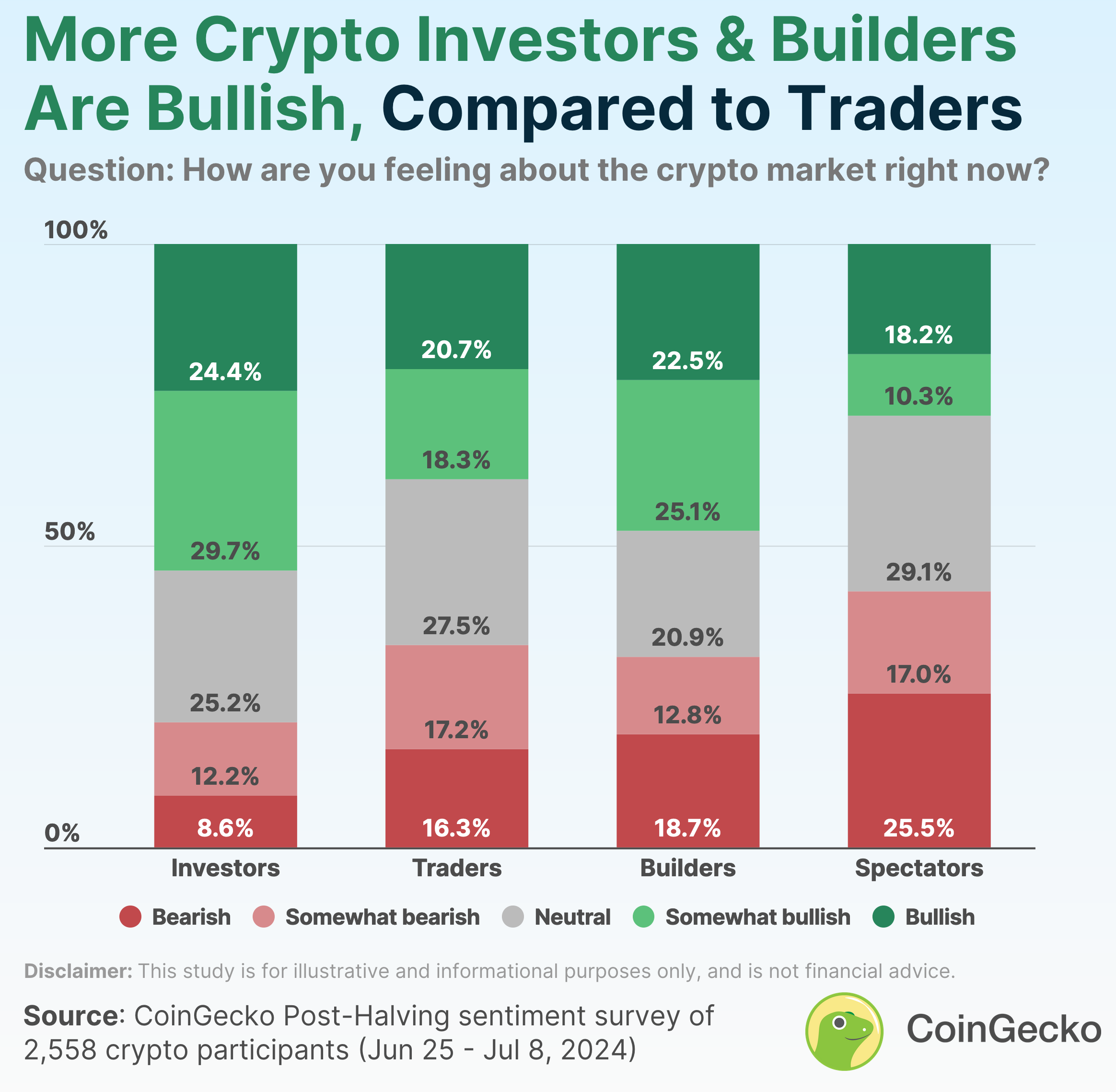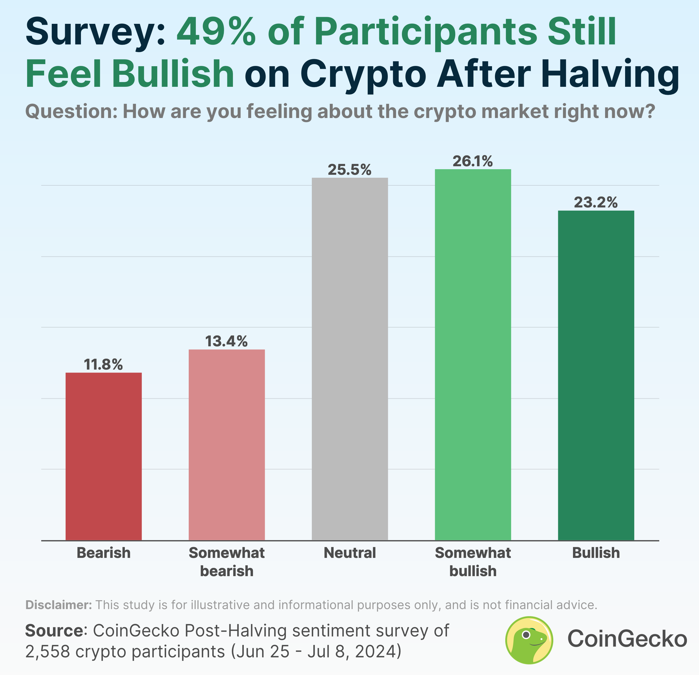 Недавний опрос CoinGecko, проведенный за последние две недели с участием более 2500 участников, показал, что только около половины криптоинвесторов и наблюдателей в настоящее время настроены оптимистично на рынке криптовалют.