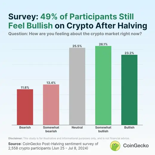 Аналитики СoinGecko считают, что из четырех категорий участников самый оптимистичный настрой сохранили долгосрочные инвесторы — 54%. А вот настроения трейдеров разделились: 39% опрошенных ожидают роста криптовалют, а 33,5% — снижения котировок.